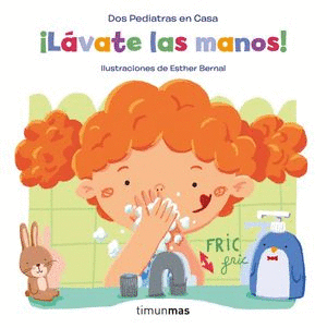 Un libro de cartón con texto rimado que ilustra paso a paso el correcto lavado de manos escrito por Elena Blanco y Gonzalo Oñoro, Dos Pediatras en Casa, e ilustrado por Esther Bernal.